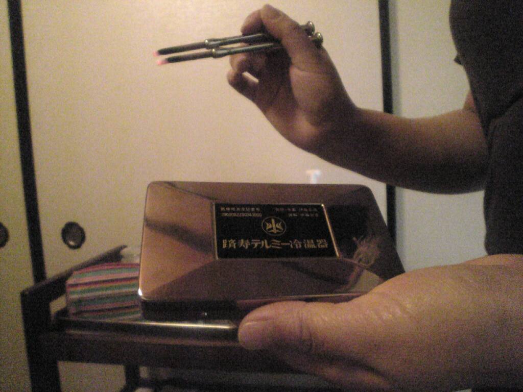 テルミーとはテルミー線というモグサなど7種類の生薬からできた線香と(冷温器)と呼ばれる金属管を用いて火を付けたテルミー線を冷温器に入れ、体をなでたり圧したりすることによって温熱刺激を与えるもののようです。